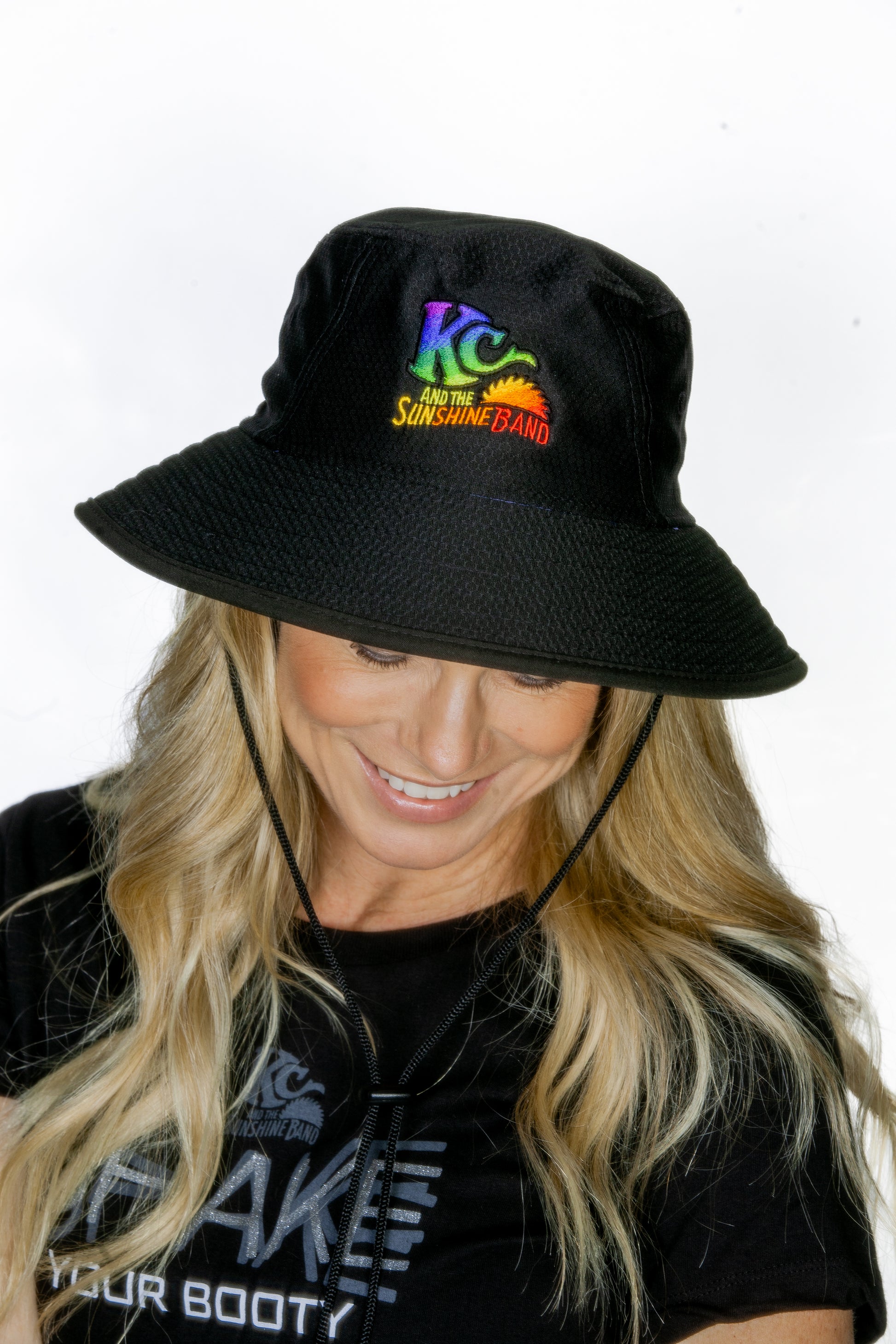 Black Sun Hat with color KC & the Sunshine Band logo, drawstring chin strap.